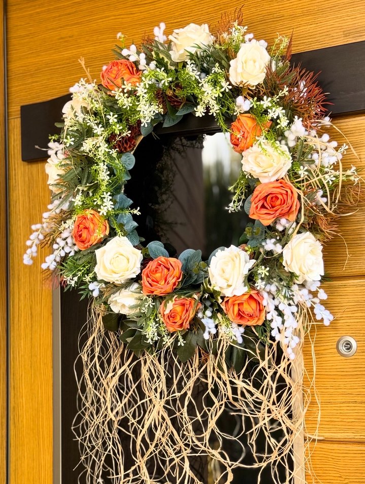 Yeşil yapraklar ve doğal dallarla süslenmiş beyaz ve turuncu çiçekli kapı çelengi.