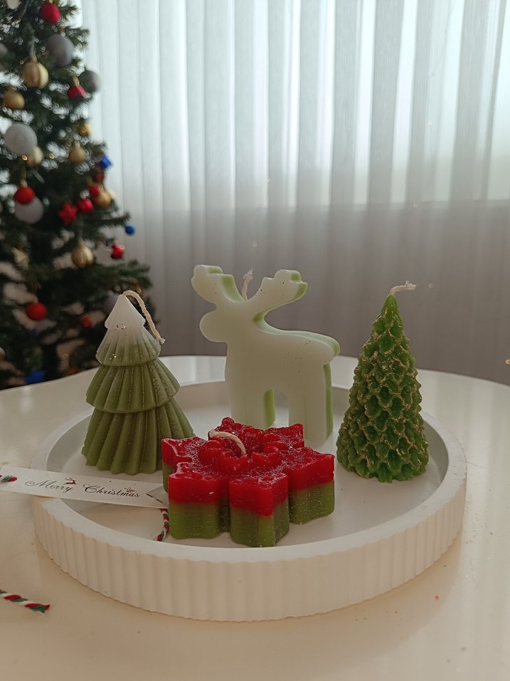Beyaz renkte geyik figürlü, yeşil yılbaşı ağacı ve kırmızı-yeşil yıldız şeklinde dekoratif mum seti.