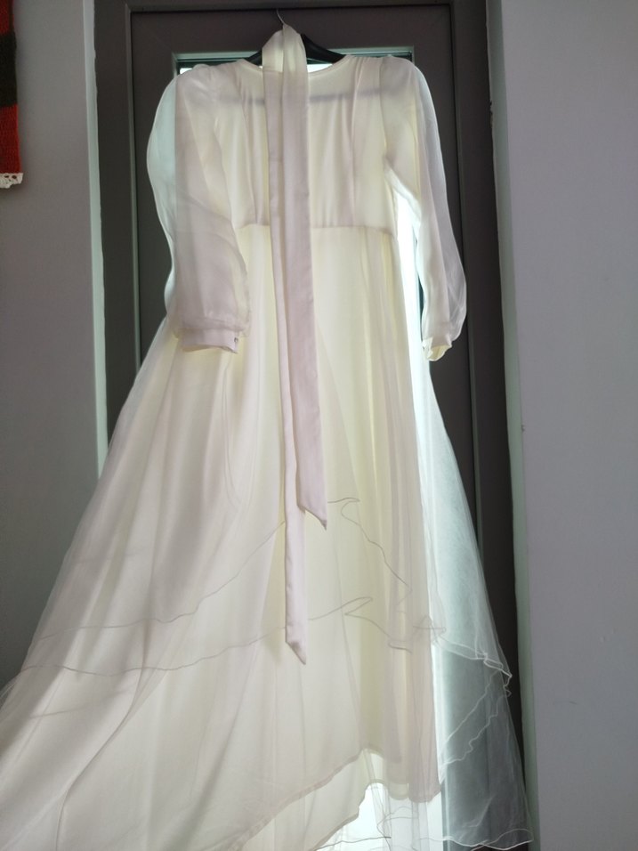 Özel dikimdir. Bir kez giyildi bir kaç saatlik. Belinde kemeri ve üzerine fiyonk detayı mevcut. Beyaz vintage tarzda uzun, bol hayal tül volanlı eteği, astarlı, nişan söz nikah için uygun abiye. Kolu inci düğmeli, organze tül ve manşetli. Yuvarlak yakası ile arkası gizli fermuarlı ucu düğmeli modern klasik şıklık sunar. 38-42 bedene olur