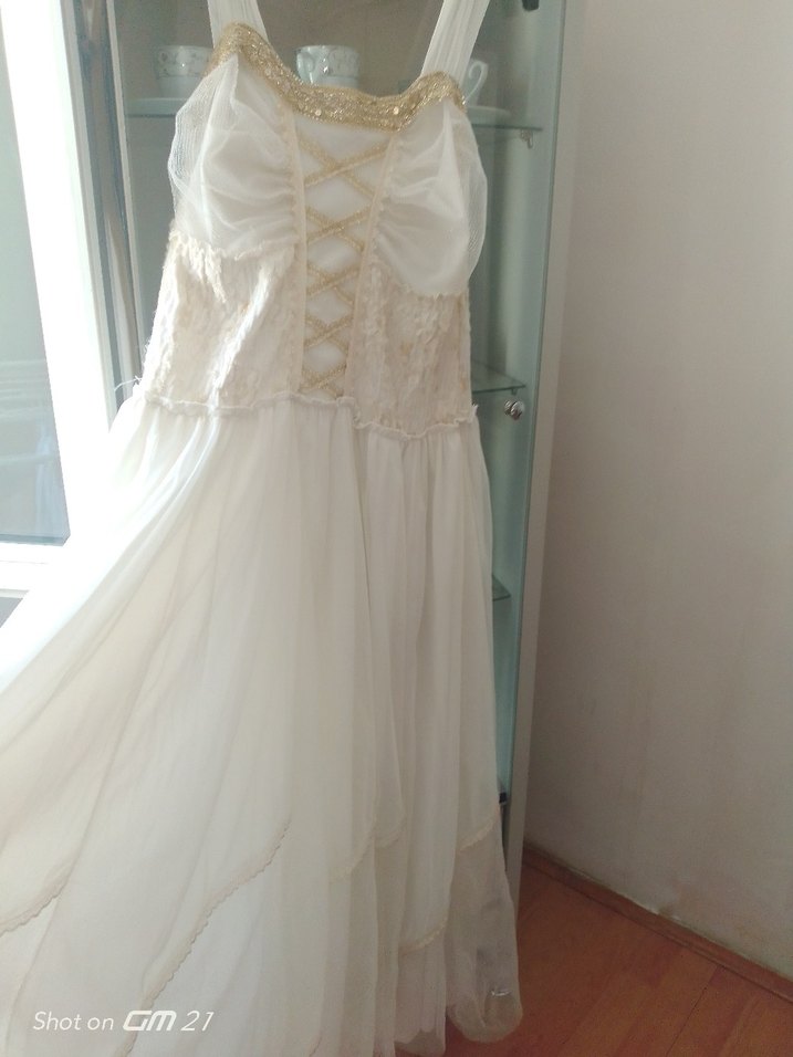 Beyaz renkli, straplez ve askılı üst kısmı olan, vintage ve bohem tarzı yansıtan A-line uzun tül detaylı abiye gelinlik son resimde eteğinin tülünde küçük bir sökük mevcut haricinde sorunsuzdur iadesi yoktur fiyatı sondur.