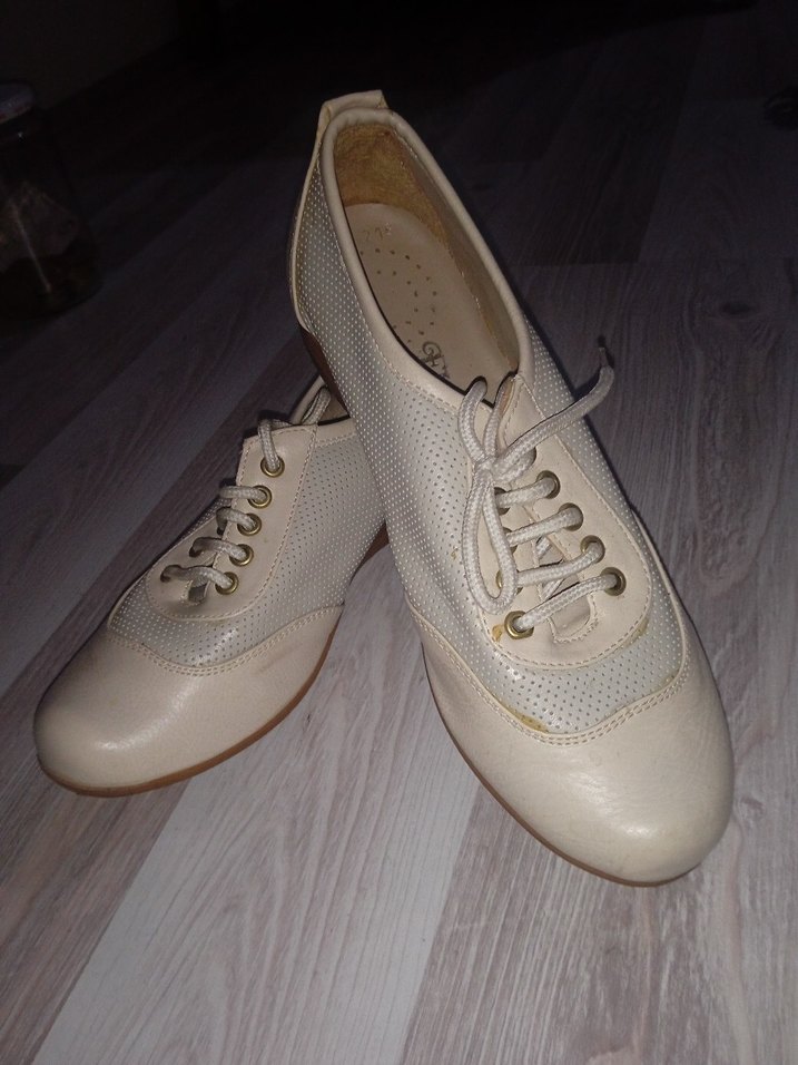 Beyaz, bağcıklı, kauçuk malzemeden yapılmış vintage tarz kadın topuklu ayakkabılar. Klasik ve desensiz tasarımı günlük kullanıma uygundur.
