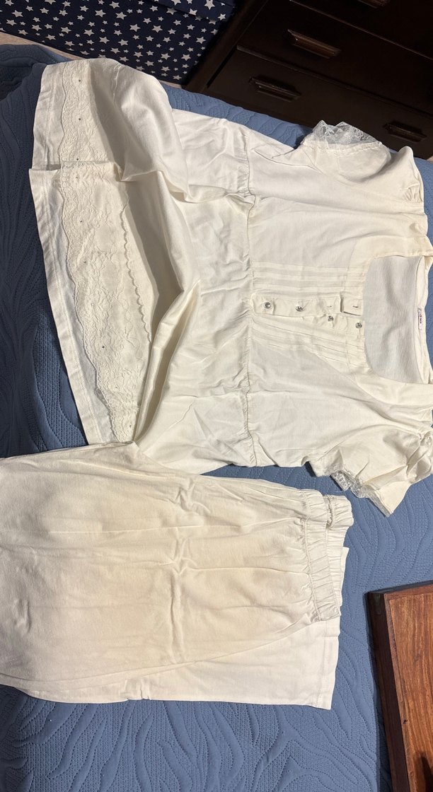 Ekru renkte, kısa kollu ve bol kesim vintage tarzı bohem kadın pijama takımı. Altı uzundur. Dantel detaylı ve düğmeli üst kısmı rahat bir kullanım sunar. Alt kısmında dolapta durmaktan hafif sarımsı leke olmuş yıkanınca geçecek türden. Ayrıca sabahlıklı gecelik takımı da vardır.