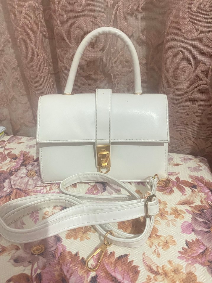 Beyaz deri çanta, vintage tarzda, tokalı kapama ve çıkarılabilir askıya sahip. Günlük kullanıma uygun klasik şıklık sunar.