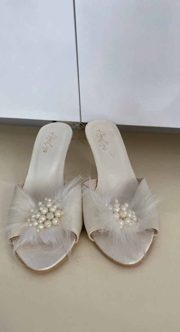 İnci işlemeli ve kürk detaylı, saten görünümlü beyaz topuklu terlik. Klasik zarafet ve düğünler için uygundur.