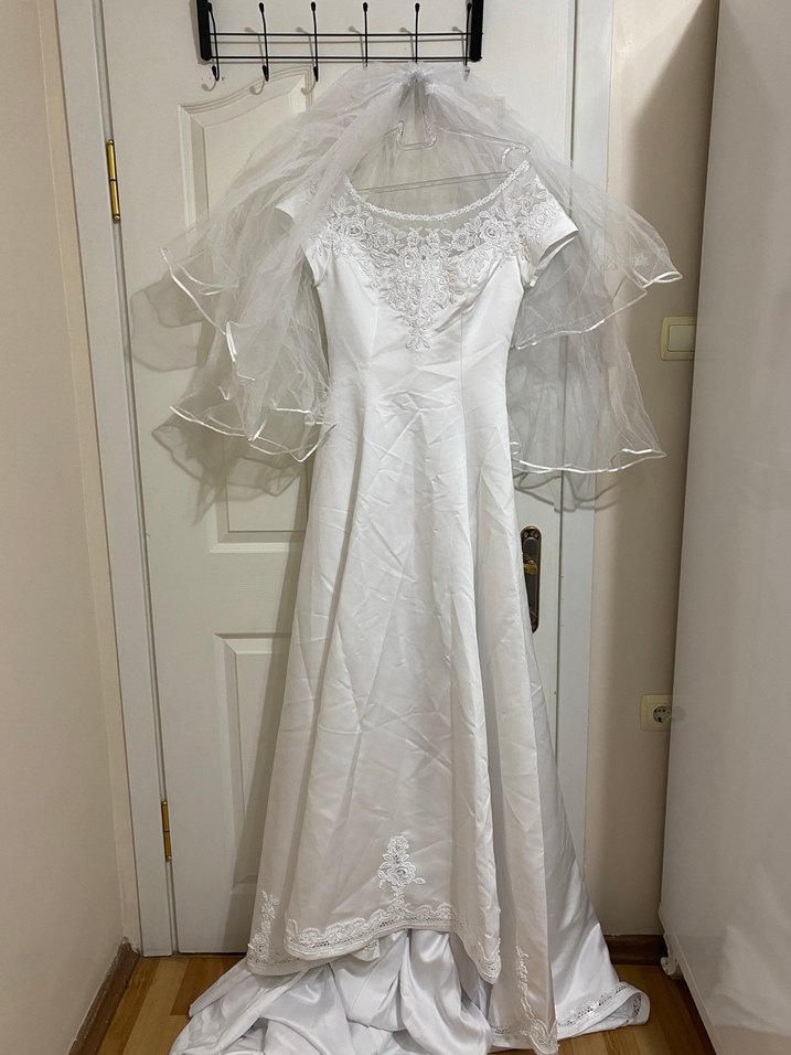 Parlak kumaştan, kısa kollu ve bol kesim beyaz vintage prenses gelinlik. Askısız yakası ve klasik uzun boyu ile geleneksel düğünler için uygun. ✨