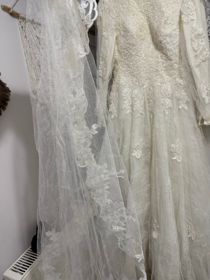 Beyaz vintage prenses gelinlik, tekne yaka ve ince askılı kollara sahip, vücuda oturan kesimlidir. Uzun boylu ve zarif dantel detaylarıyla klasik şıklık sunar. 176 boy 70 kiloda giyildi tadilat ve kuru temizleme yapılma ihtimali için fiyat uygun yırtık sökük yok etek uçları kısmı kirlendi