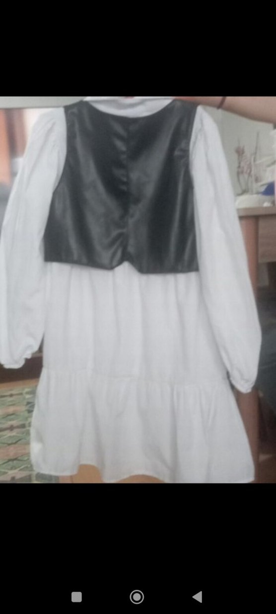 Volan detaylı, askısız beyaz mini elbise, siyah deri yelek ile kombinlenmiş. Salaş kesim, kolsuz ve desensiz, günlük kullanıma uygun.