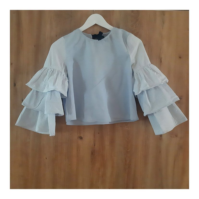 Uzun volanlı kollara ve yuvarlak yaka sahip beyaz kadın bluz, bol kesim ve kısa boydadır. Yumuşak sentetik kumaştan, hafif desenlidir, günlük sokak stili için uygundur.