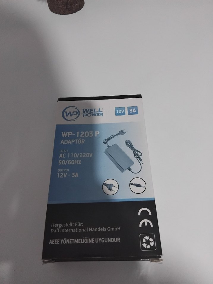 Beyaz WP-1203P adaptör, 12V çıkış ve 3A akım sağlar, AC110/220V giriş ve 50/60Hz frekans uyumludur. ⚡
