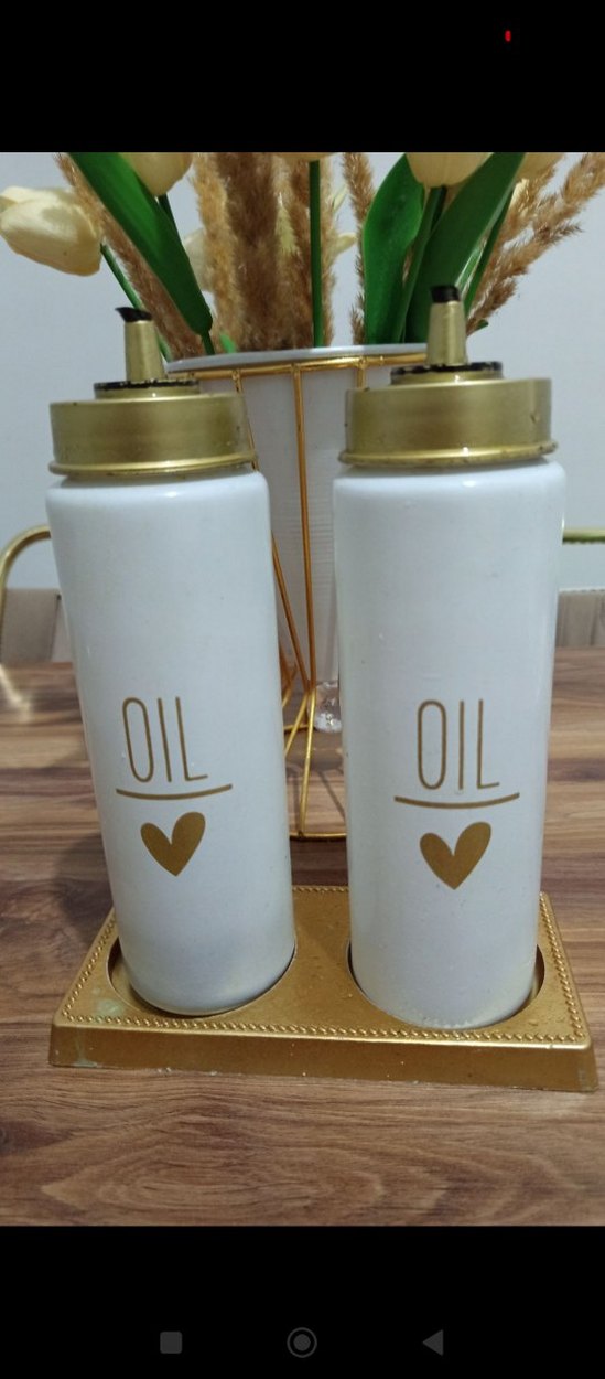 Altın detaylı beyaz iki yağlık ve altın renk tepsi içeren set, üzerinde "OIL" ve kalp simgesi bulunur.