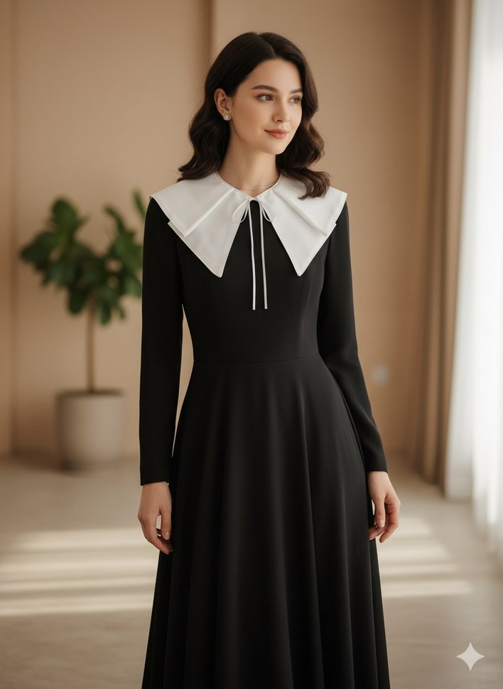 Uzun siyah elbise, beyaz yakalı ve pilili ipeksi kumaştan. Uzun kollu, klasik gotik tarzda, ofis için uygun, regular fit.