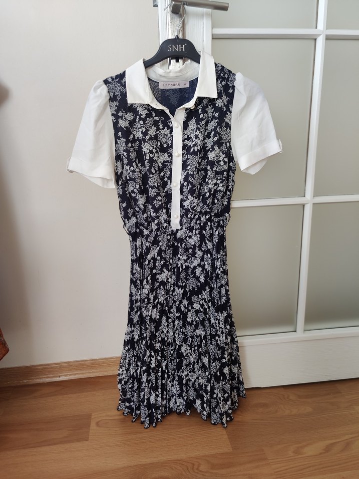 Beyaz yakalı, kısa kollu, lacivert beyaz çiçek desenli, pileli ve vücuda oturan midi elbisedir. Sentetik kumaştan yapılmıştır, günlük sokak stili için uygundur.