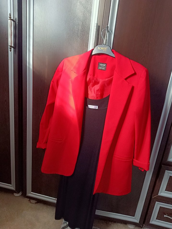 Kemerli, parlak kırmızı renkli kadın blazer, saten dokulu ve normal kesimde. Ofis için klasik zarif tarzda, yakası kesik ve askılı kolludur. Midi boy ve desensizdir.