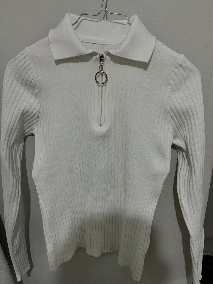 Yakalı, uzun kollu, fermuarlı beyaz triko, vücuda oturan kesim ve normal boyda. Günlük kullanım için rahat sokak tarzı.