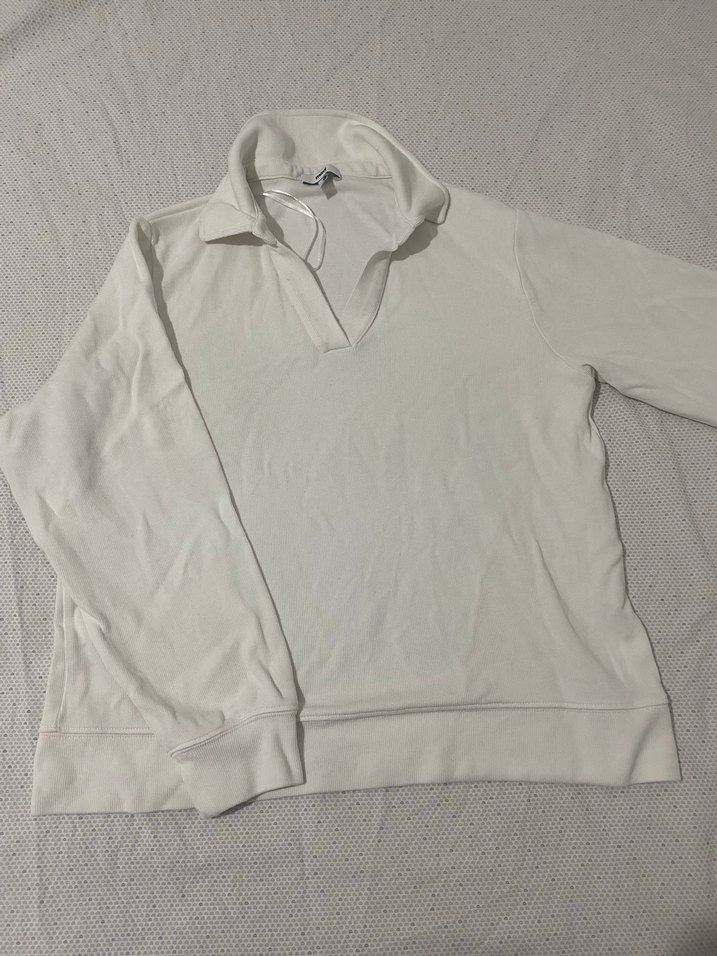 Beyaz, yakalı ve uzun kollu, keten kumaştan yapılmış bol kesim bir kadın sweatshirtü. Günlük kullanıma uygun rahat bir sokak stili sunar.
