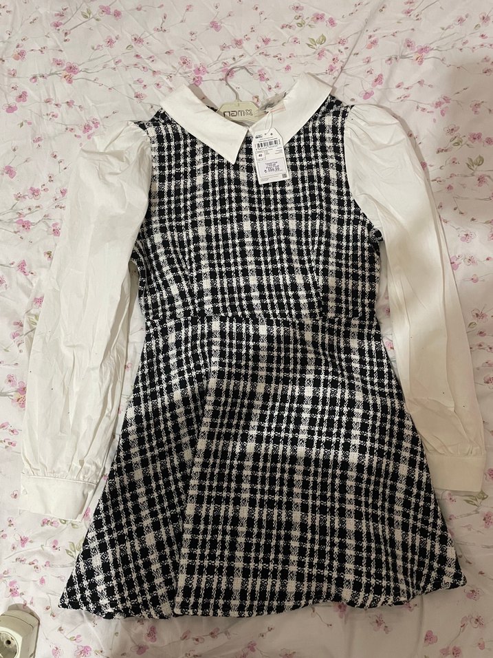 Dar kesim kadın elbise, beyaz yakalı ve fırfırlı uzun kollara sahip. Siyah beyaz pötikareli sentetik kumaş ile gotik ve trend bir tarz sunar. Ofis elbisesi gibi, küçük geldiği için hiç giyemedim, etiketi duruyor.