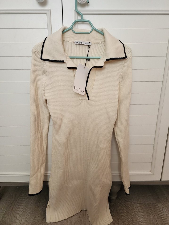 Uzun kollu, yakalı ve siyah detaylı beyaz triko elbise. Günlük kullanıma uygun şık ve rahat bir modeldir.