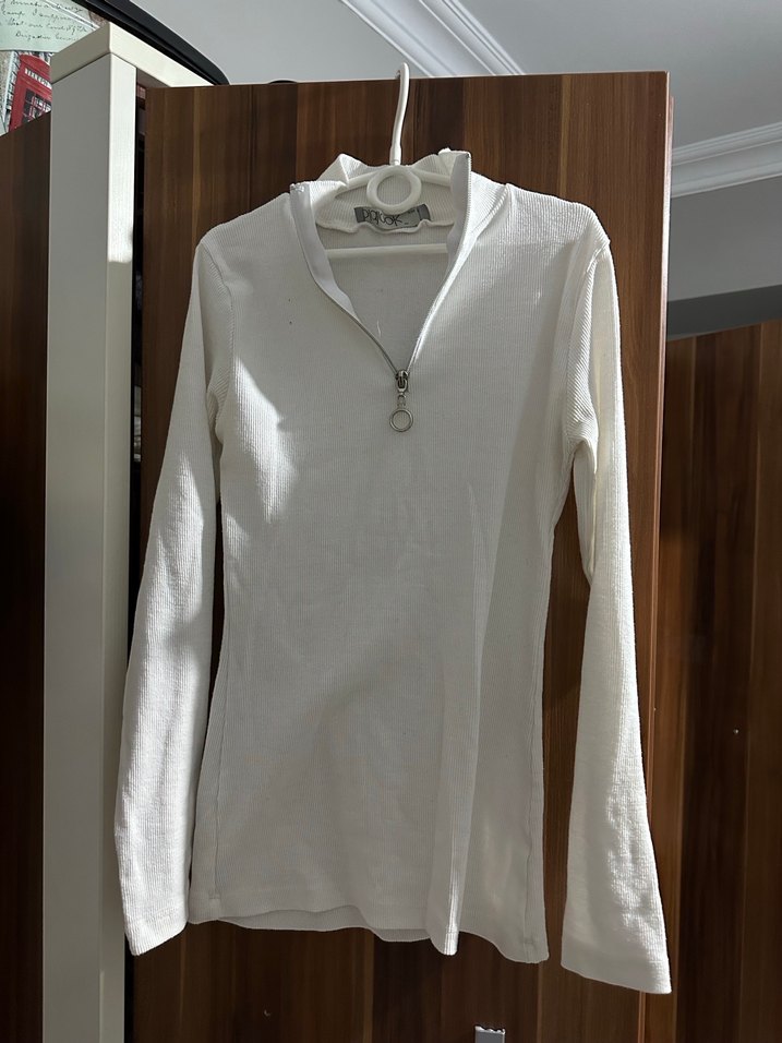 Beyaz uzun kollu, fermuarlı yakalı kadın kazağı, günlük sokak stiline uygun dar kesim.