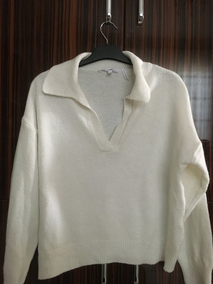 Bu beyaz örgü kazak, yakalı ve uzun kolludur. Yumuşak ve sıcak tüylü kumaştan yapılmıştır. Gevşek kesimi ve normal boyu ile rahat sokak stiline uygundur. ❄️ çok hafif pamuklanmadı var ama kumaş yapısından kaynaklıdır kullanıma engel sorunu yoktur
