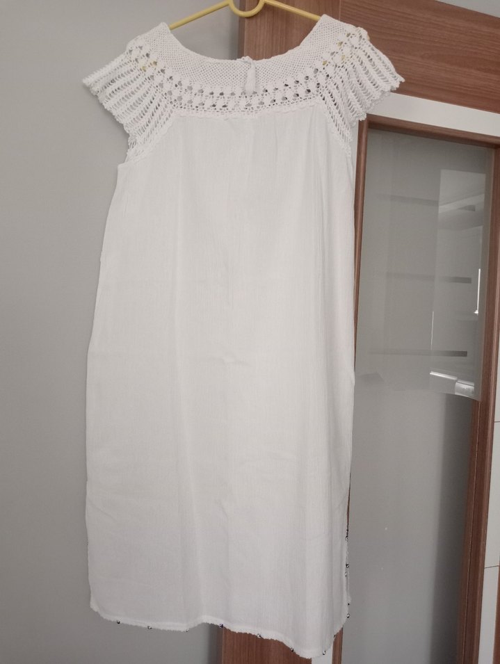 Beyaz, dantel detaylı, kayık yakalı, kısa kollu elbise.Rahat kesim, midi boy ve hafif kumaştan üretilmiştir. Danteli el yapımıdır.Alt tarafı şile bezi olduğu için setin tutar ve çok rahat bir elbisedir.Etek ucunda yanlarda küçük yirtmaclari vardır ve etek ucu nazar boncuklariyla suslenmistir.38 40 beden uyumludur.