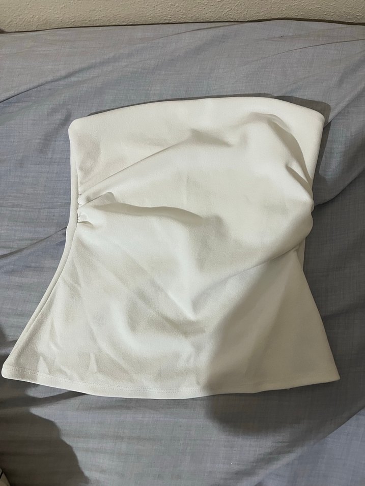 Beyaz renkte, drapeli ve straplez tasarıma sahip sıkı oturan crop.