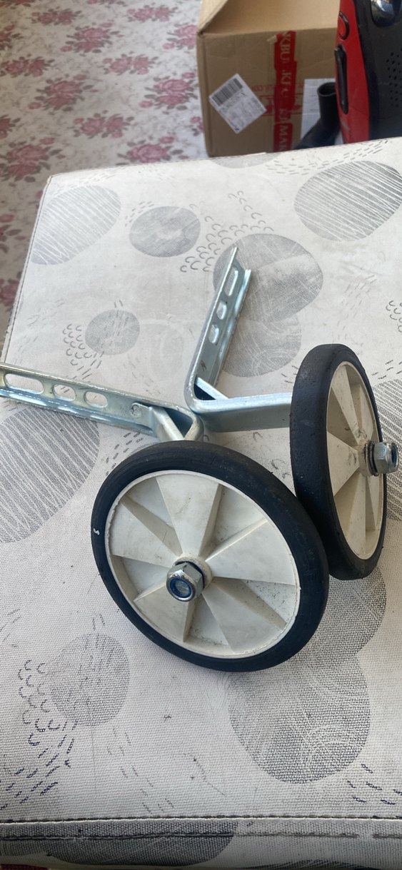 Beyaz yan tekerlekler ve gri metal bağlantılarla üç tekerlekli bisiklete denge sağlar.