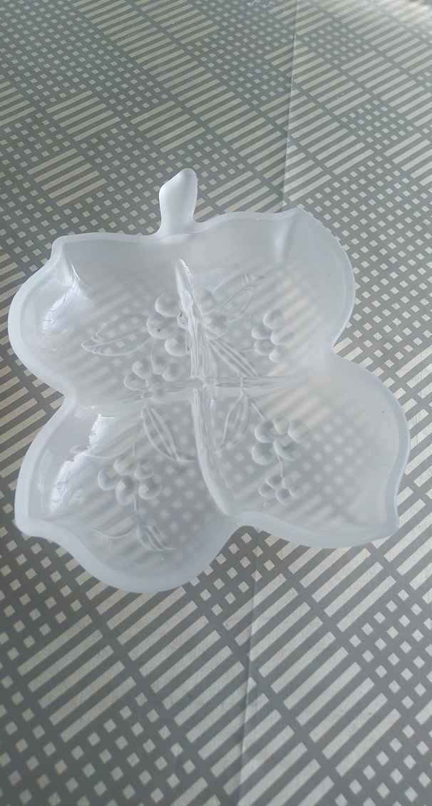 Beyaz, yaprak şeklinde, üzüm desenli kabartmalı düz malzemeden yapılmış tabak. ️