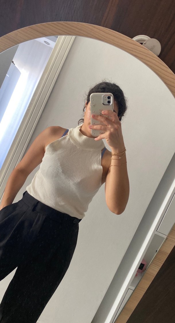 Beyaz, yarım balıkçı yaka, kolksuz, pamuk kumaştan yapılmış, normal midi uzunlukta ve vücuda oturan kadın süveter. Minimalist, desensiz tasarımıyla günlük kullanıma uygundur.