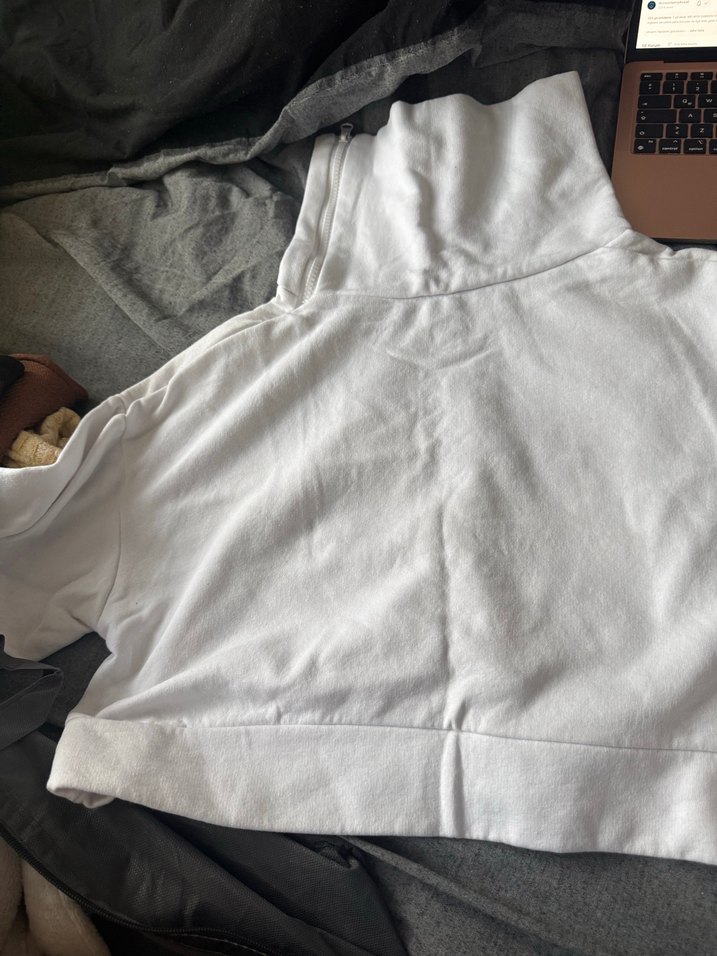 Beyaz renkte, boğazlı ve kısa kollu, fermuarlı detaylı, yumuşak ve sıcak kumaştan yapılmış, normal boyda dar kesim sweatshirt.