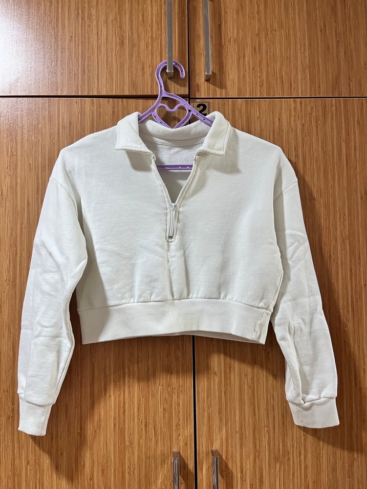Beyaz Yarım Fermuarlı Crop Sweatshirt