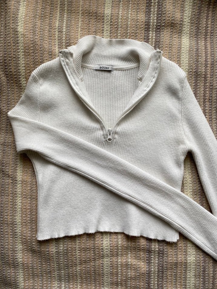 Beyaz renkli, yarım fermuarlı ve uzun kollu triko kazak. Vücuda oturan kesimi ve normal uzunluğu ile şık ve rahat bir sokak stili sunar. Yumuşak örgü kumaştan üretilmiştir.