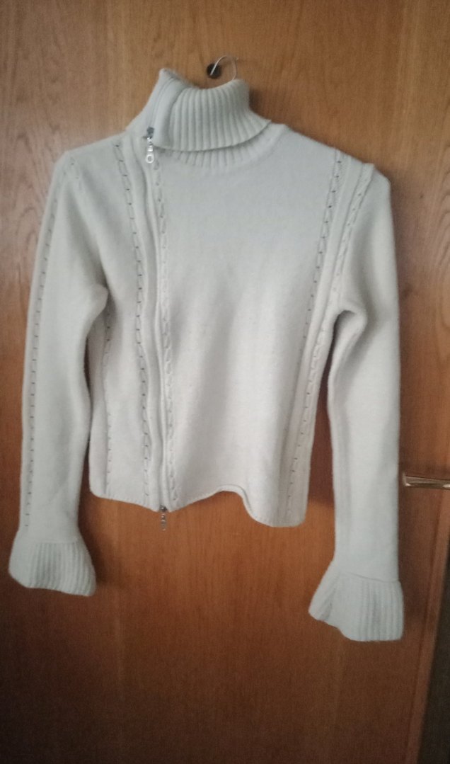 Yarım fermuarlı yüksek yaka ve uzun kollu beyaz örme kazak, rahat ve günlük kullanıma uygun tarz sunar. shetland yün..ince ve sıcak