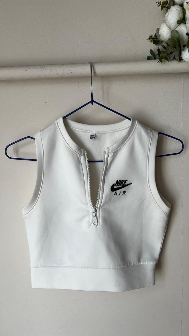 Yüksek yakalı, yarım fermuarlı beyaz atleti. Düz sentetik kumaştan, Nike Air baskılı, trend günlük stil için uygun. ♀️