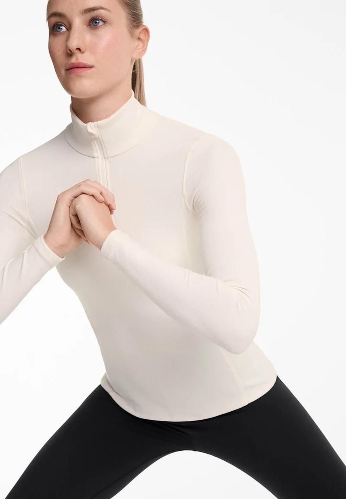 OYSHO Kadınlar için yüksek yakalı, yarım fermuarlı, uzun kollu ve yumuşak dokulu beyaz spor üst. Düz ve midi boyda, sportif aktiviteler için rahat şıklık sunar. ♀️