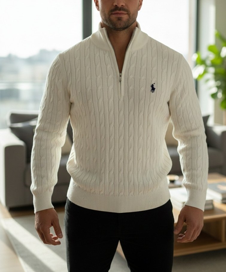Yarım fermuarlı, yüksek yakalı, pamuklu, beyaz renkli ve örme dokulu, günlük kullanıma uygun, erkek için dar kesim kazak.