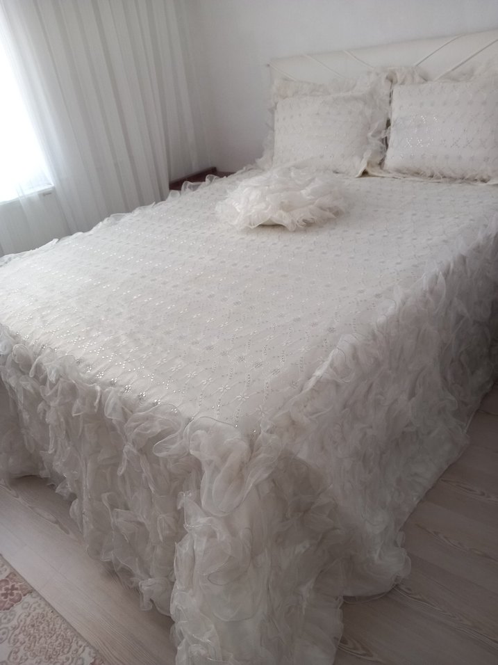 Desenli, fırfırlı kenarlarıyla beyaz yatak örtüsü, odanıza zarif ve hafif bir dokunuş katar. ️