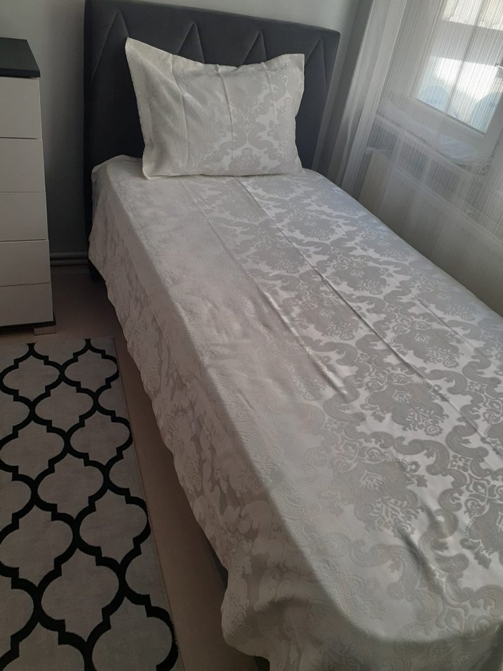 Tek kisilik 2 adet elimde mevcur. şık desenlere sahip beyaz yatak örtüsü, yatağı düzgünce kaplar. Aynı desende yastık kılıfı dahildir. ️1 kez sünnet yatağı için kullanilmistir