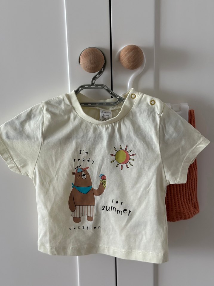 Pamuklu kumaştan, kısa kollu ve yuvarlak yakalı beyaz erkek bebek tişörtü ve şortu. Sadece 1-2 defa kullanıldı.Temiz üründür.
