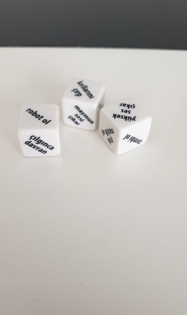 Üzerinde 'onu kokla' ve 'çok nazik ol' gibi Türkçe ifadeler bulunan beyaz oyun zarları.