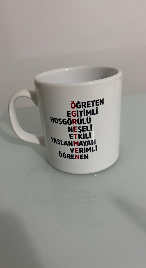 Öğreten, eğitimli ve hoşgörülü gibi kelimelerle tasarlanmış beyaz seramik kupa. ☕