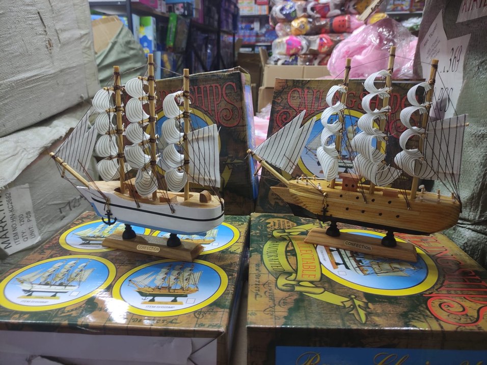 Detaylı yelken ve direklerle ahşaptan yapılmış iki beyaz yelkenli gemi figürini, orijinal kutularında sergileniyor. ⚓