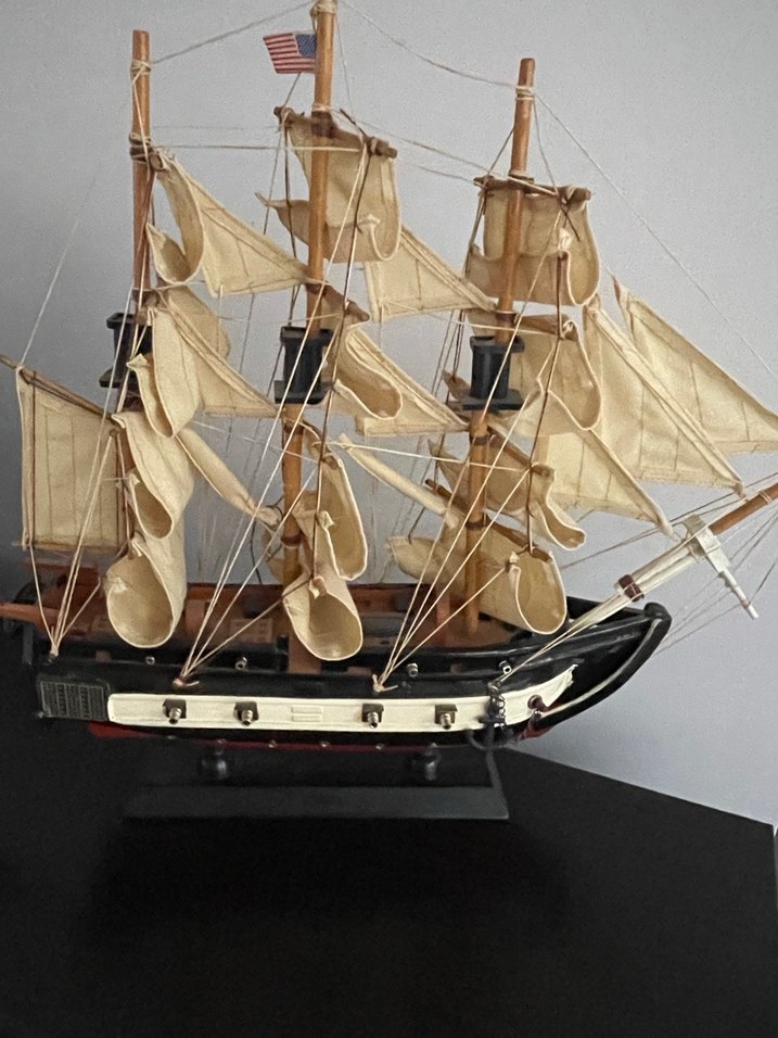 Detaylı yelken ve halatları olan beyaz ahşap yelkenli gemi figürini, siyah tabana monte edilmiştir. Küçük Amerikan bayrağı bulunur. ⛵