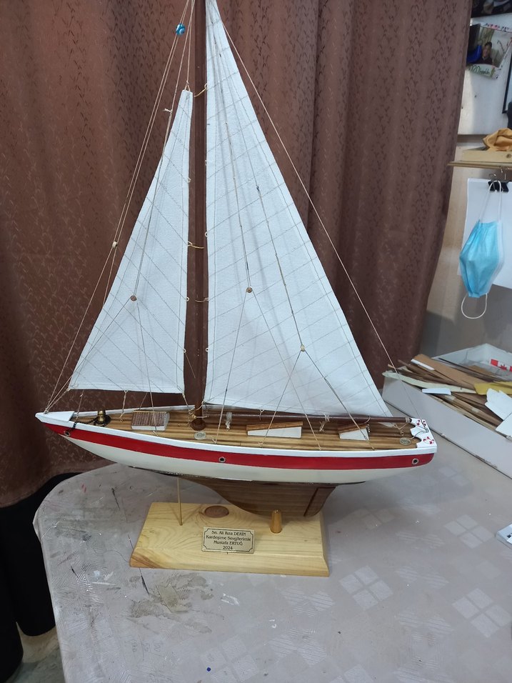 Detaylı beyaz yelkenleri ve kırmızı şeridi olan yelkenli gemi maketi, ahşap taban üzerinde sergilenir. ⛵40 cm boyunda 50 cm yükseklik