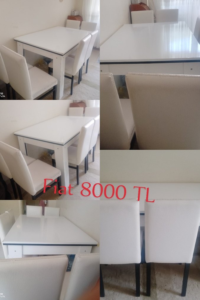 Beyaz yemek masası ve altı beyaz sandalye.deri sandalye Masada çekmece bulunur. Fiyat: 8000 TL. ️