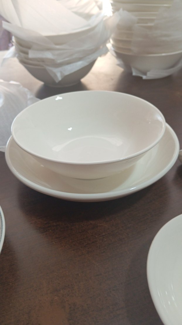 Pürüzsüz, açık renkte malzemeden yapılmış beyaz kase ve tabak seti, yiyecek servisinde kullanılabilir. ️