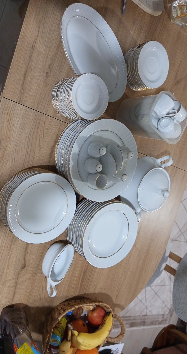 Beyaz renkli, tabaklar, kaseler, fincanlar ve servis kaplarından oluşan yemek takımı seti. Yemek servisi için eksiksiz bir koleksiyon sunar. ️