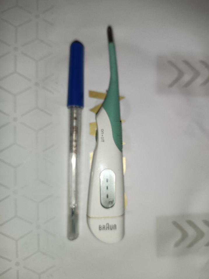 Braun marka beyaz-yeşil dijital termometre, kolay okunabilir ekran ve açma/kapama düğmesine sahiptir. Koruyucu mavi kapak ile birlikte gelir. ️