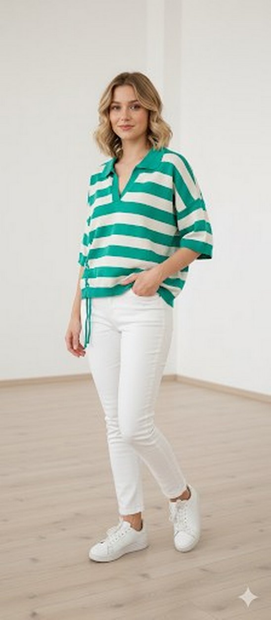 Yeşil beyaz çizgili, kısa kollu, V yakalı, kemerli pamuklu kadın kazak. Rahat kesimiyle günlük kullanıma uygundur.