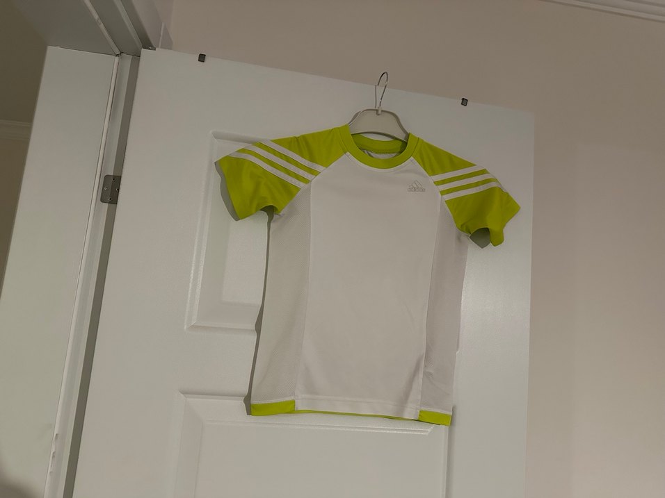 Beyaz gövde ve açık yeşil kollarda baskılı çizgiler bulunan yumuşak ve nefes alan çocuk tişörtü.