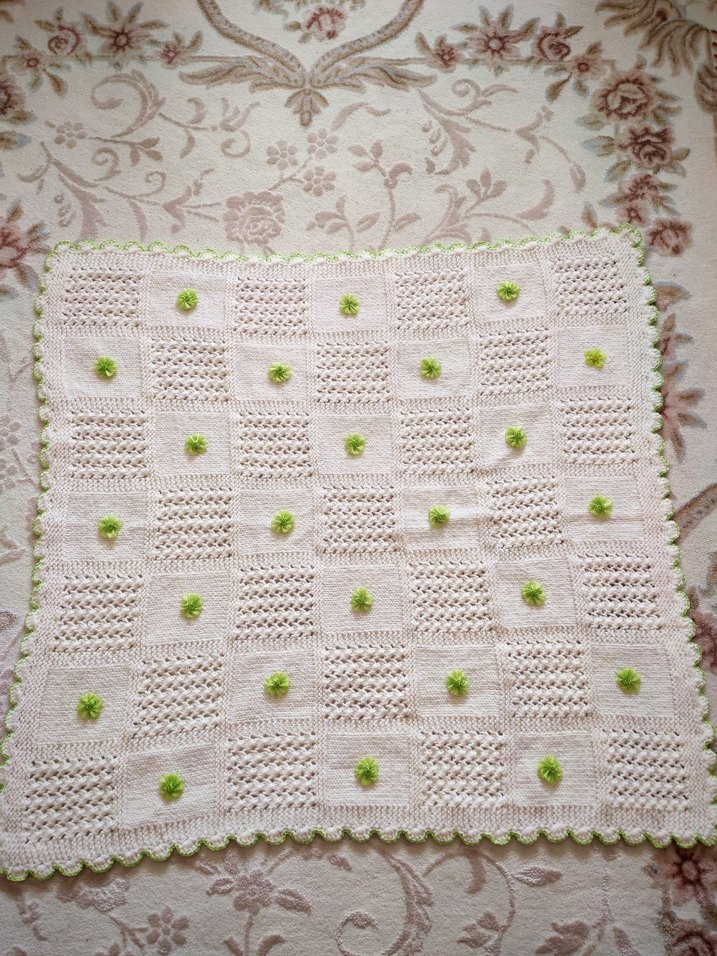 Beyaz örgü bebek battaniyesi, pastel yeşil küçük detaylarla süslenmiş, yumuşak ve rahat bir dokunuş sağlar. 80x80 ölçüsü var.